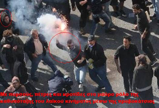 Έτσι κράτησαν την εργατική διαδήλωση. Έτσι δε διαλύθηκε προς απογοήτευση όσων το σχεδίαζαν. Μαρτυρίες του κόσμου μιλούν για 50 άρηδες που έδιναν χάπια σε παιδιά με κουκούλες και τα προέτρεπαν να "τα σπάσουν" και για εφοδιασμένους με φοιτητικά πάσο ασφαλίτες. Άλλες πηγές μιλούν για αστυνομικούς που αλλάζουν στολή και ντύνονται με πολιτικά και κουκούλες για διευθύνουν το μπάχαλο.